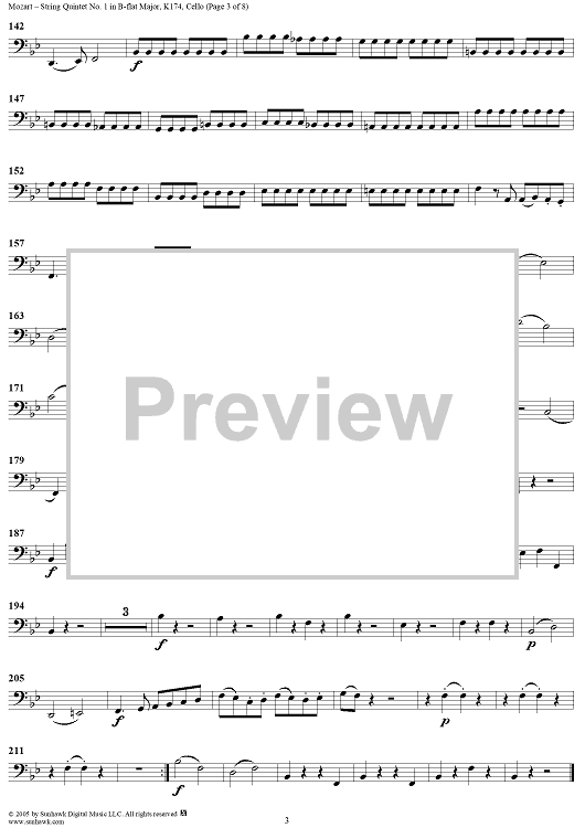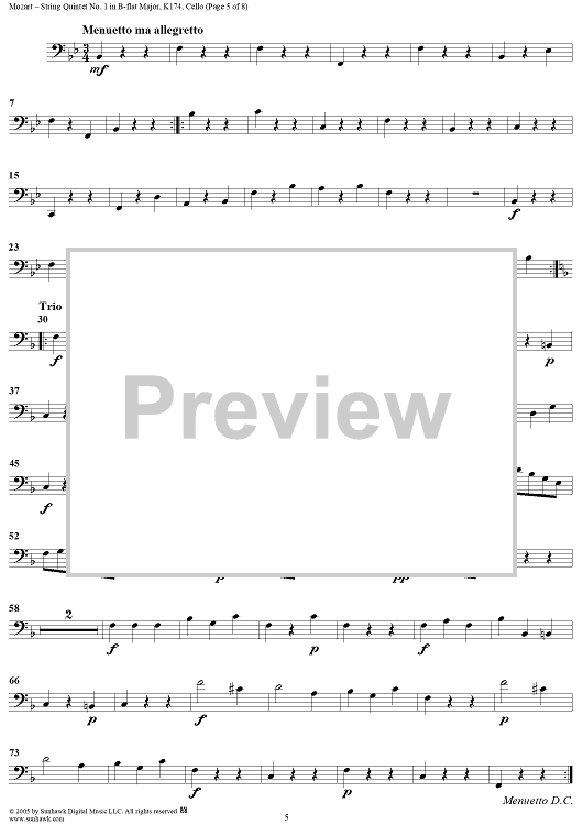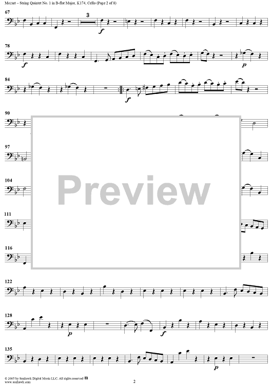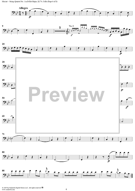 Digital Sheet Music for String Quintet No. 1 in B-Flat Major, K174 - Cello by Wolfgang Amadeus Mozart scored for String Quintet; id:309281