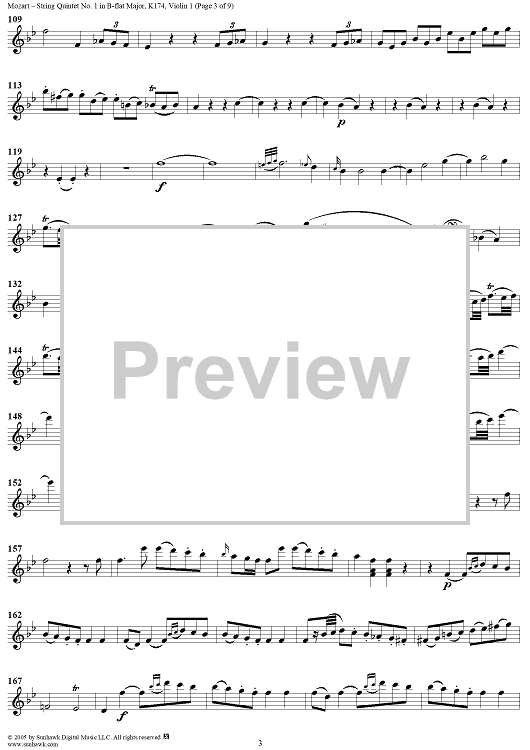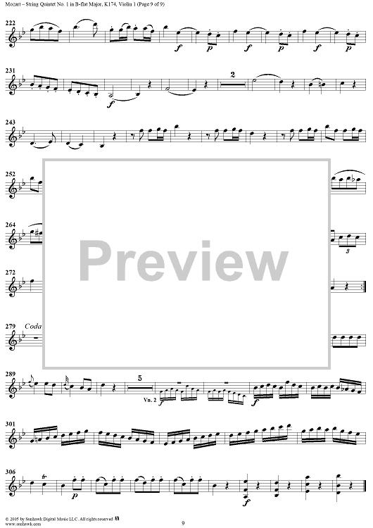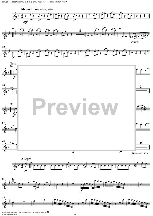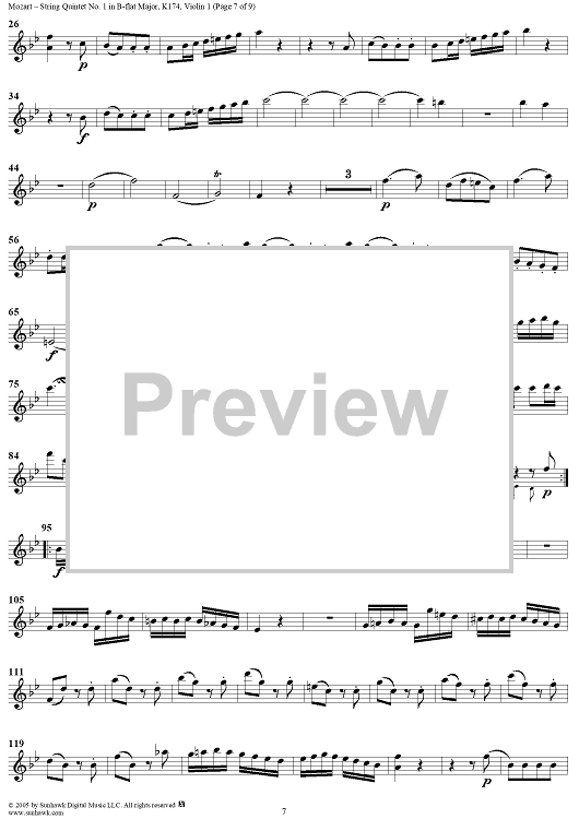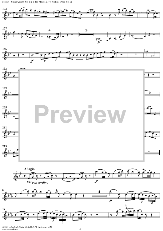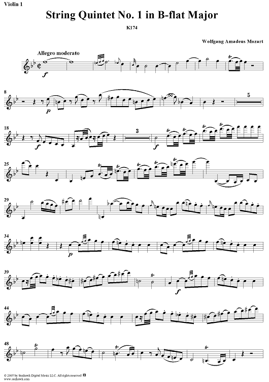 Digital Sheet Music for String Quintet No. 1 in B-Flat Major, K174 - Violin 1 by Wolfgang Amadeus Mozart scored for String Quintet; id:309277