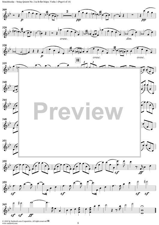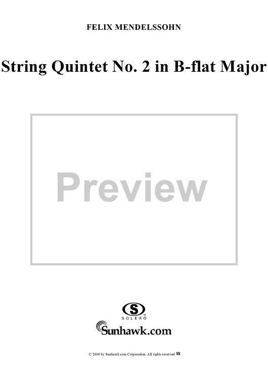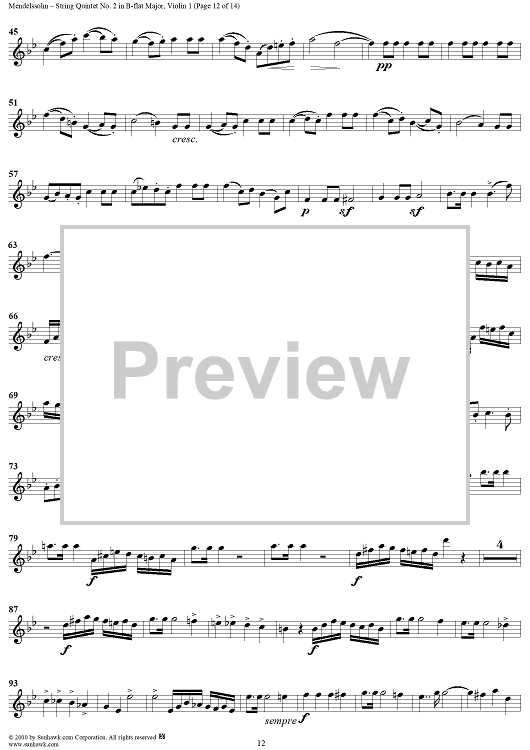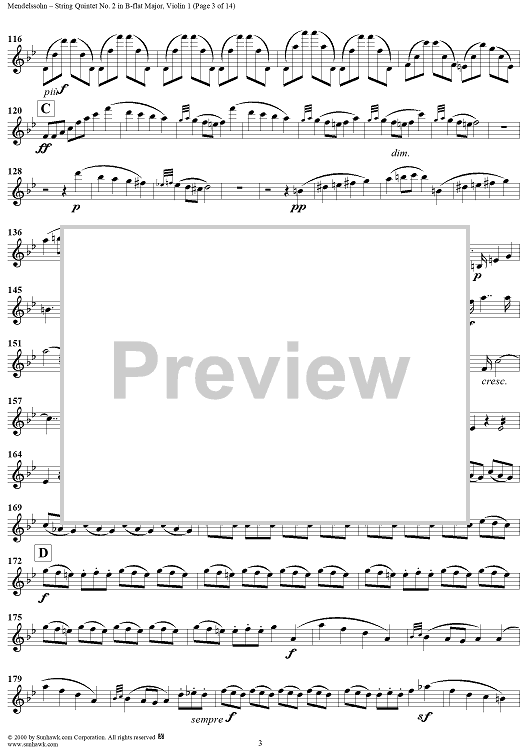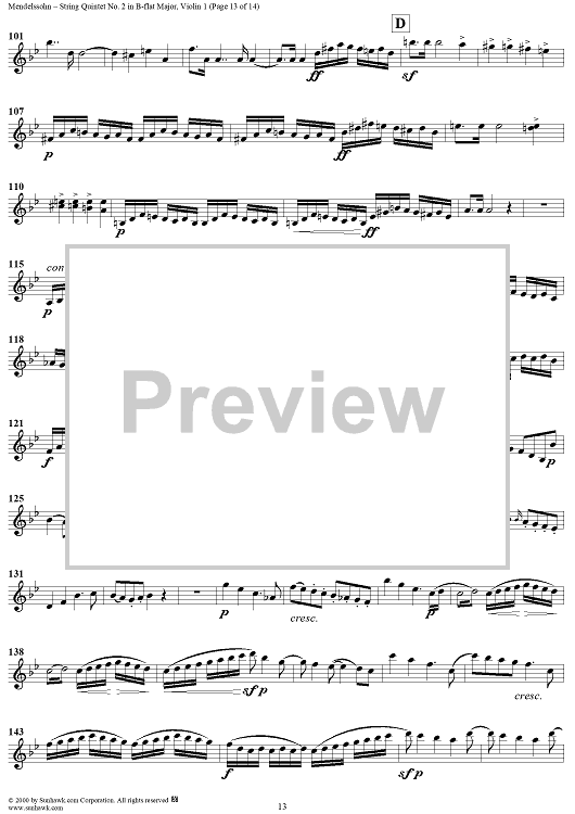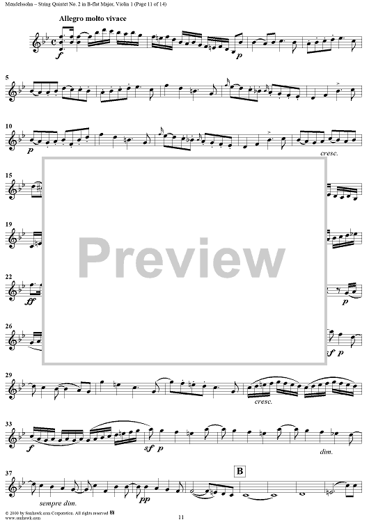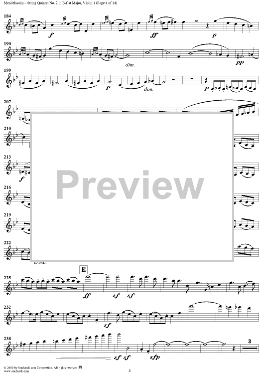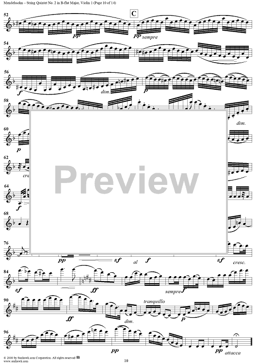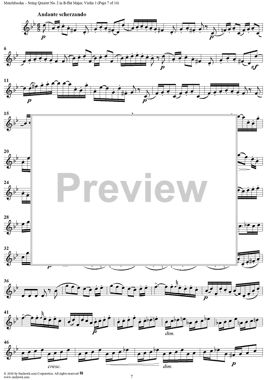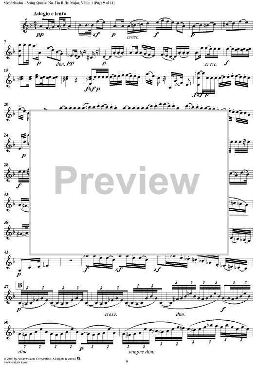 Digital Sheet Music for String Quintet No. 2 in B-flat Major, Op. 87 - Violin 1 by Felix Mendelssohn scored for String Quintet; id:251946