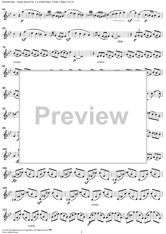 "String Quintet No. 2 in B-flat Major, Op. 87 - Violin 1" Sheet Music by Felix Mendelssohn