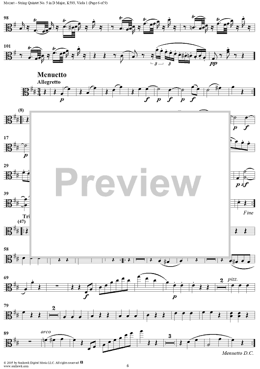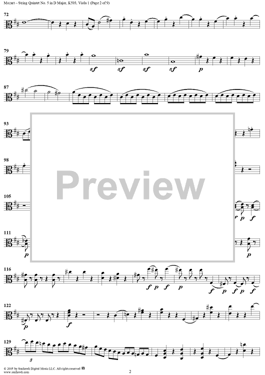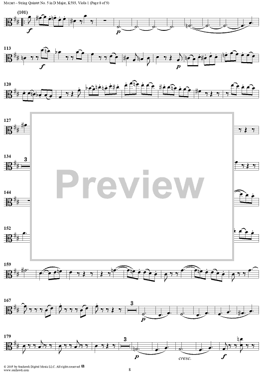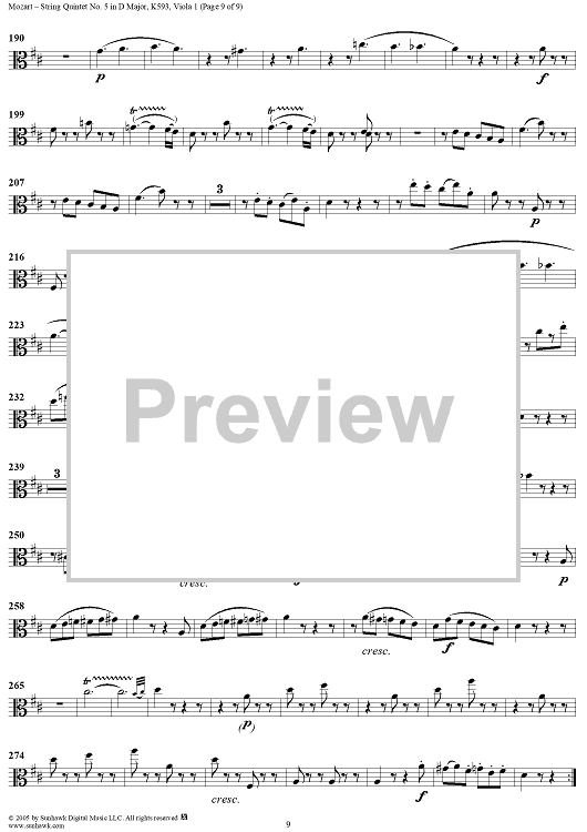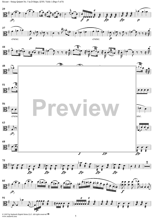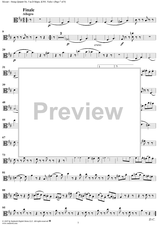 Digital Sheet Music for String Quintet No. 5 in D Major, K593 - Viola 1 by Wolfgang Amadeus Mozart scored for String Quintet; id:309299