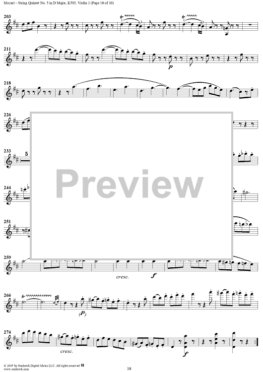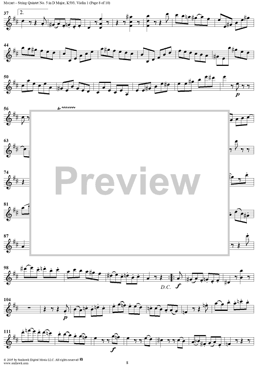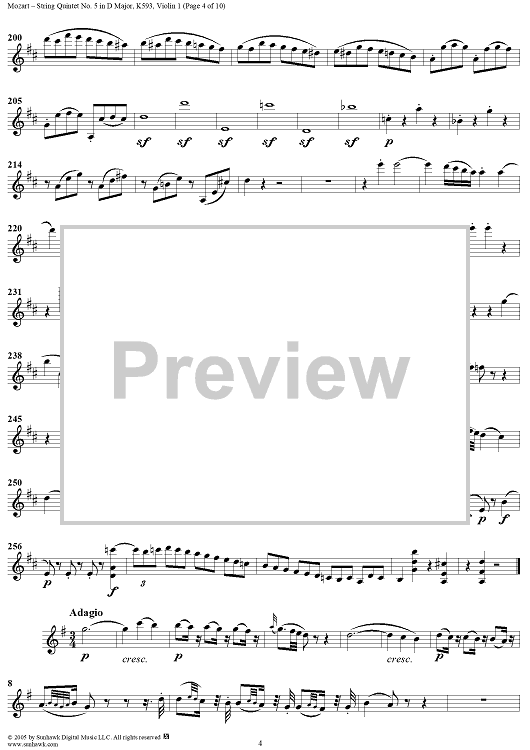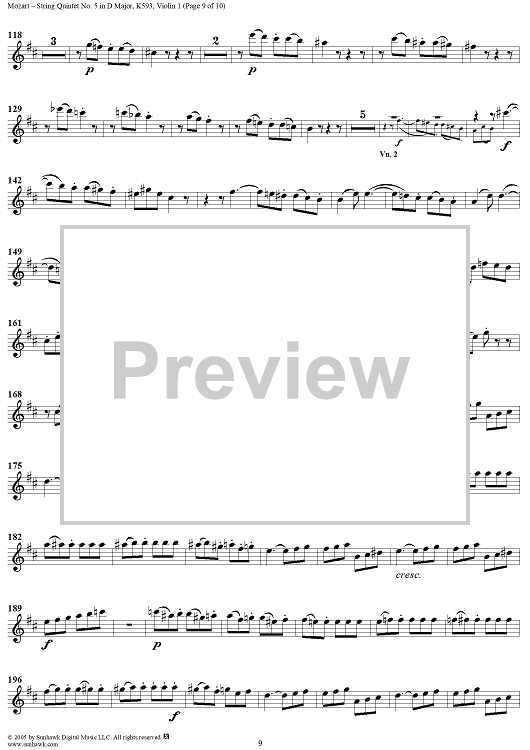 Digital Sheet Music for String Quintet No. 5 in D Major, K593 - Violin 1 by Wolfgang Amadeus Mozart scored for String Quintet; id:309297