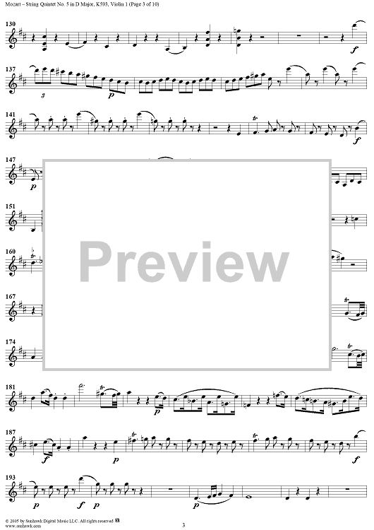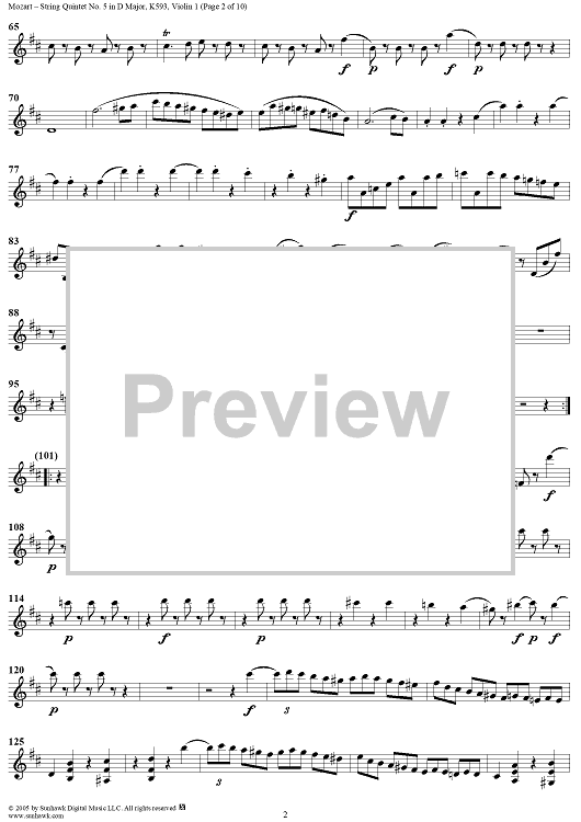 "String Quintet No. 5 in D Major, K593 - Violin 1" Sheet Music by Wolfgang Amadeus Mozart