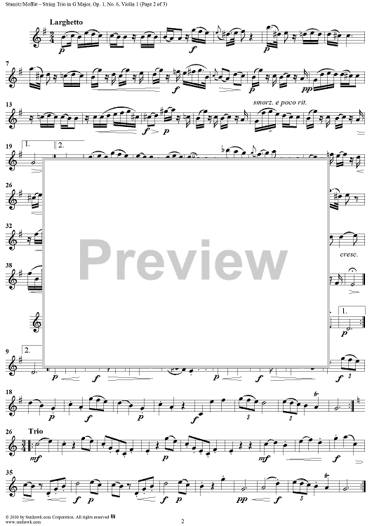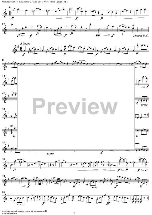 Digital Sheet Music for String Trio in G major op. 1, no. 6 - Violin 1 by Johann Stamitz scored for Two Violins/Cello; id:235143