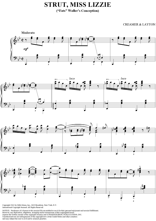 Digital Sheet Music for Strut, Miss Lizzie (''Fats'' Waller's Conception) by Fats Waller, Henry Creamer, Turner Layton scored for Piano Solo; id:316820