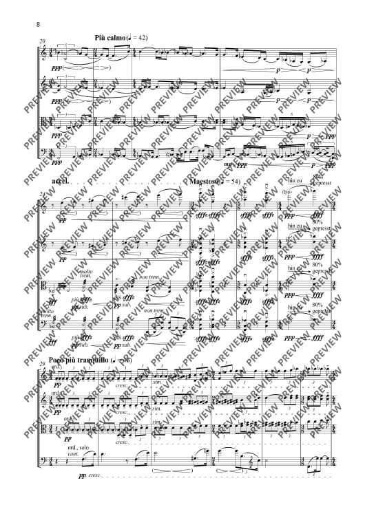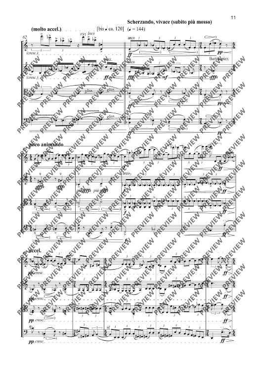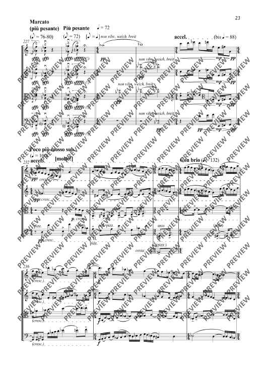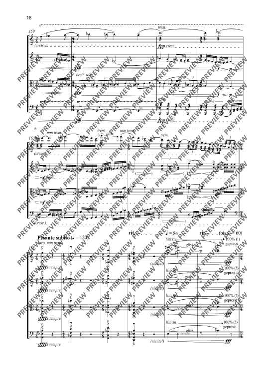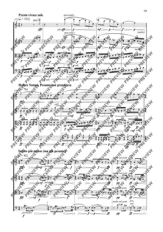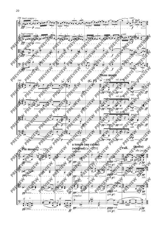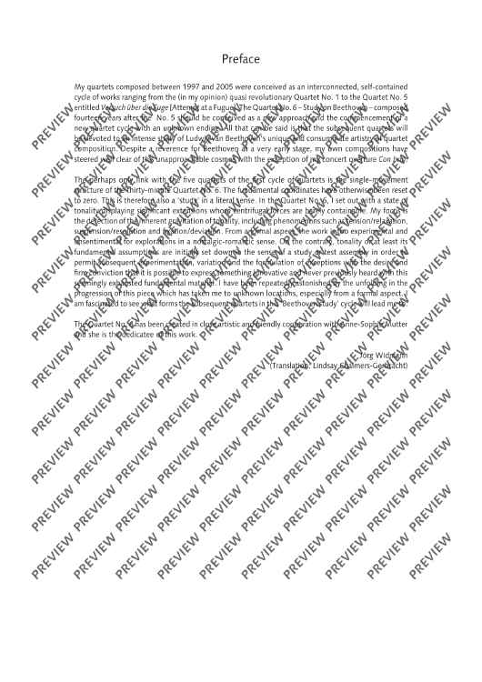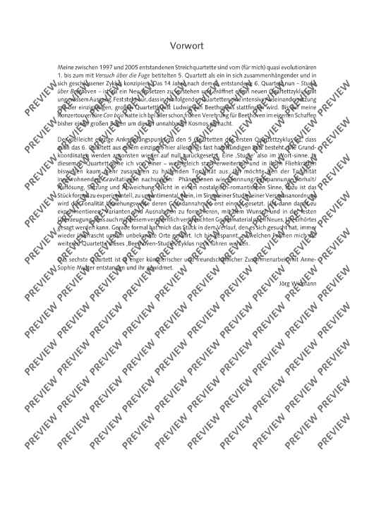 My quartets composed between 1997 and 2005 were conceived as an interconnected, self-contained cycle of works ranging from the (in my opinion) quasi revolutionary Quartet No. 1 to the Quartet No. 5 entitled Versuch über die Fuge [Attempt at a Fugue]. The Quartet No. 6 – Study on Beethoven – composed fourteen years after No. 5 should be conceived as a new approach and the commencement of a new quartet cycle with an unknown ending. All that can be said is that the subsequent quartets will be devoted to an intense study of Ludwig van Beethoven’s unique and consummate artistry of quartet composition. Despite a reverence for Beethoven at a very early stage, my own compositions have steered well clear of this unapproachable cosmos with the exception of my concert overture Con brio. The perhaps only link with the five quartets of the first cycle of quartets is the single-movement structure of the thirty-minute Quartet No. 6. The fundamental coordinates have otherwise been reset to zero. This is therefore also a ‘study’ in a literal sense. In the Quartet No. 6, I set out with a state of tonality displaying significant extensions whose centrifugal forces are barely containable. My focus is the detection of the inherent gravitation of tonality, including phenomenons such as tension/relaxation, suspension/resolution and fixation/deviation. From a formal aspect, the work is too experimental and unsentimental for explorations in a nostalgic-romantic sense. On the contrary, tonality or at least its fundamental assumptions are initially set down in the sense of a study or test assembly in order to permit subsequent experimentation, variation and the formulation of exceptions with the desire and firm conviction that it is possible to express something innovative and never previously heard with this seemingly exhausted fundamental material. I have been repeatedly astonished by the unfolding in the progression of this piece which has taken me to unknown locations, especially from a f