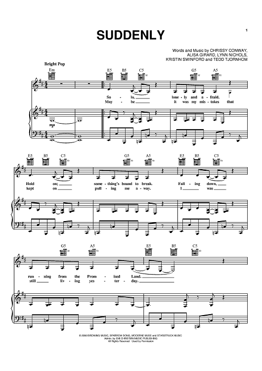Digital Sheet Music for Suddenly by Chrissy Conway, Alisa Girard, Kristin Swinford scored for Piano/Vocal/Chords; id:367562