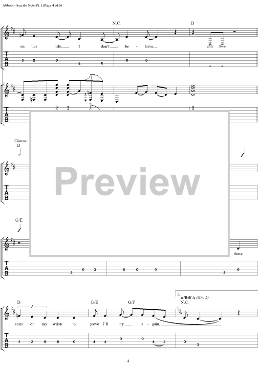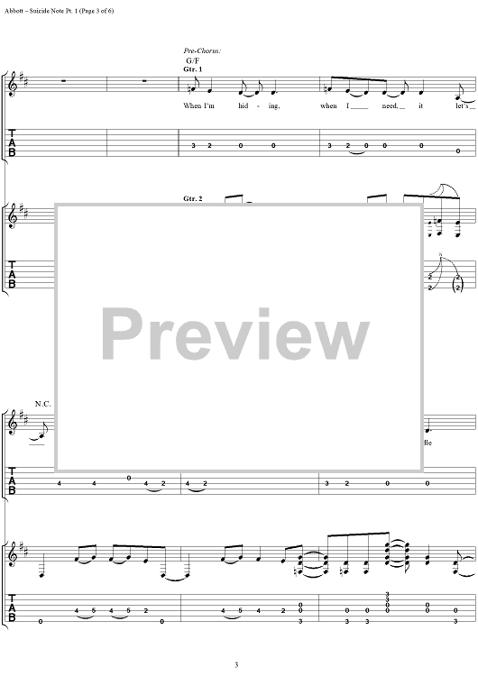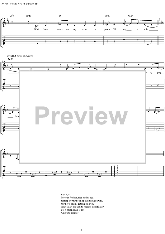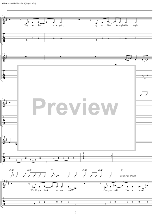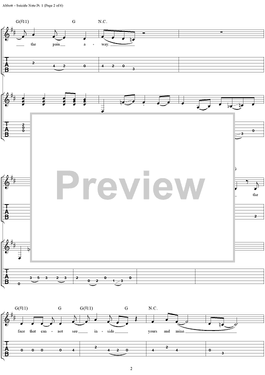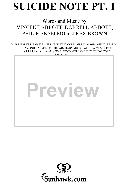 Digital Sheet Music for Suicide Note Pt. 1 by Rex Brown, Dimebag Darrell, Phil Anselmo, Pantera, Vinnie Paul scored for Easy Guitar Tab/Vocal; id:119956