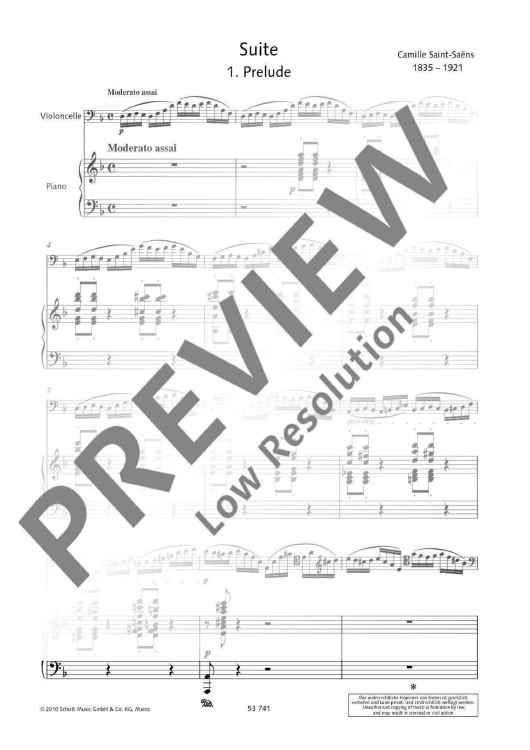 Apart from his 'classic', the First Concerto, Camille Saint-Saëns composed other works for the violoncello, such as his 'Suite' Op. 16. Written in 1862, the work lives on the composer's examination of tradition, especially of the form of the Baroque suite incorporated in a Romantic tonal language. This edition presents the original version of the work: for violoncello and piano. (The composer later arranged it and exchanged two movements, published as CB 229.) The five-movement suite begins with a prelude reminiscent of Bach which is followed by a pleasant serenade, a burlesque scherzo, and a sentimental romance, before it comes to an end with a virtuoso and rapturous finale. The tuneful and joyful-to-play 'Suite' is a valuable addition to the cello literature and suitable for tuition and concert alike.
