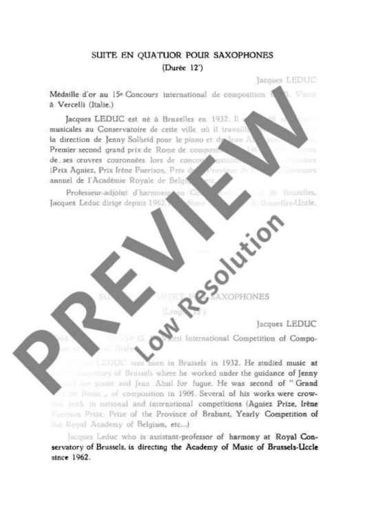 Digital Sheet Music for Suite en Quatuor - Full Score by Jacques Leduc scored for 4 Saxophones; id:496261