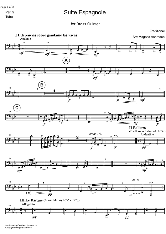 Digital Sheet Music for Suite Espagnole - Tuba by Mogens Andresen, Traditional scored for Brass Quintet; id:323745