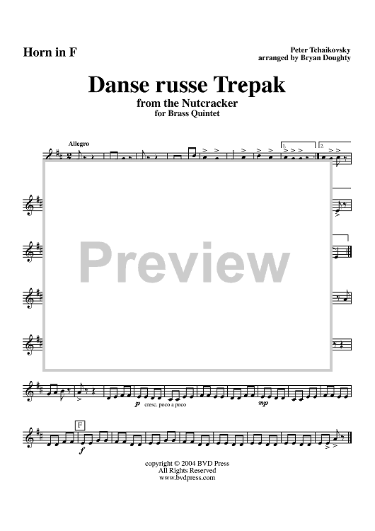 Digital Sheet Music for Suite from ''The Nutcracker''. Danse russe Trépak - Horn in F by Bryan Doughty, Peter Ilyich Tchaikovsky scored for Brass Quintet; id:314041