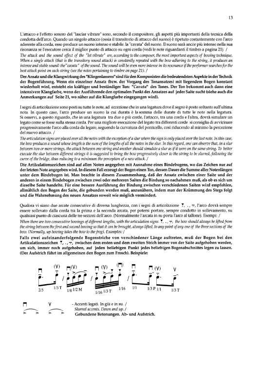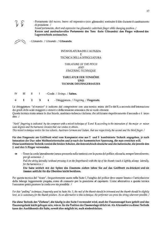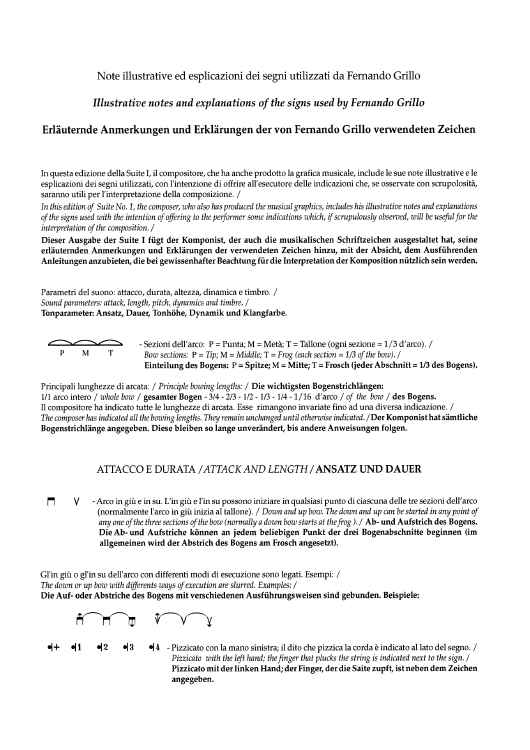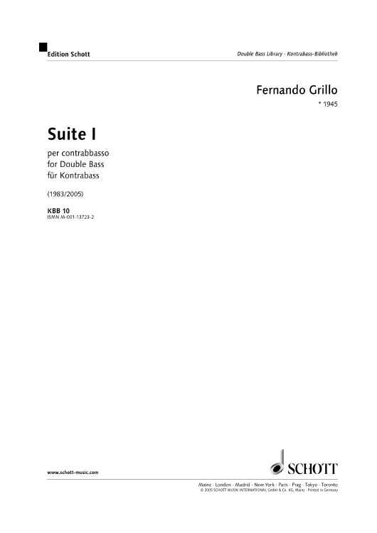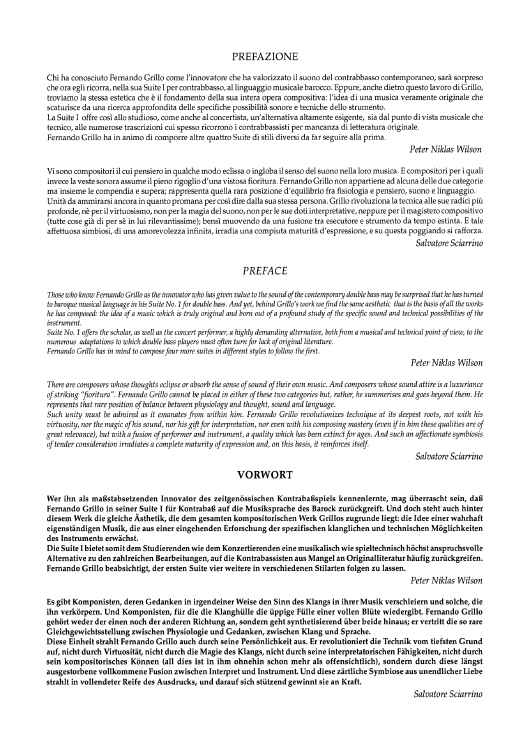 Fernando Grillo, double bass player and composer, is one of the most original exponents of contemporary music. His attention is focused in particular on new techniques for string instruments and aspects of sound production. Suite I, which harks back to the musical language of the Baroque era, offers both students and concert performers a musically and technically very challenging alternative to the numerous arrangements to which double bass players often have recourse, for want of original material for their instrument.