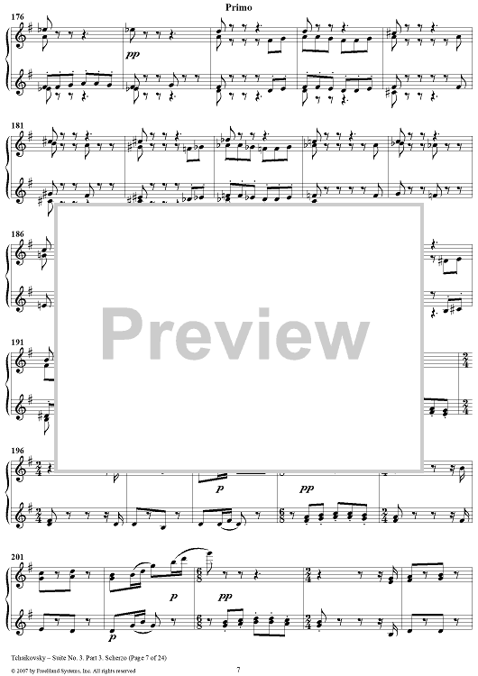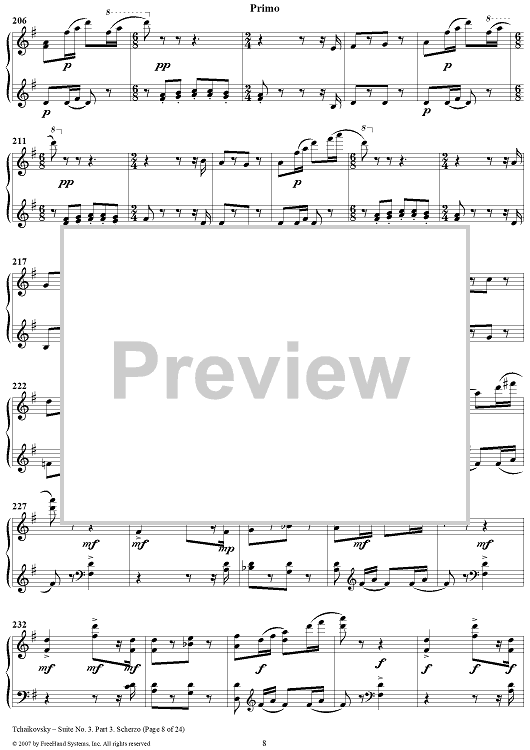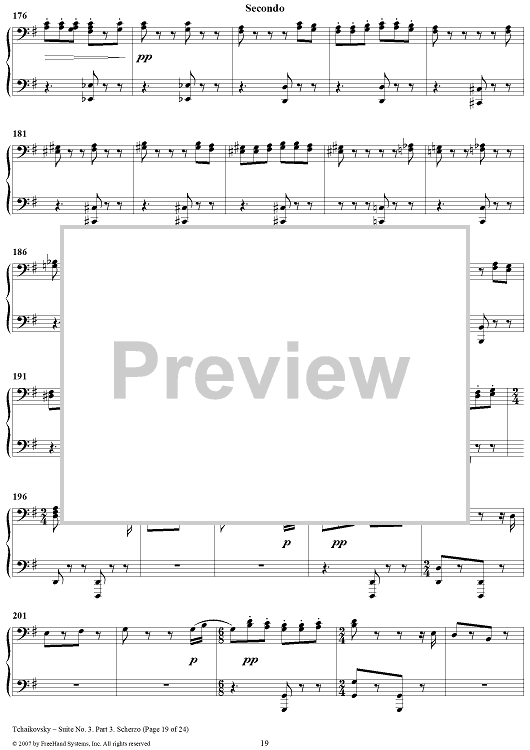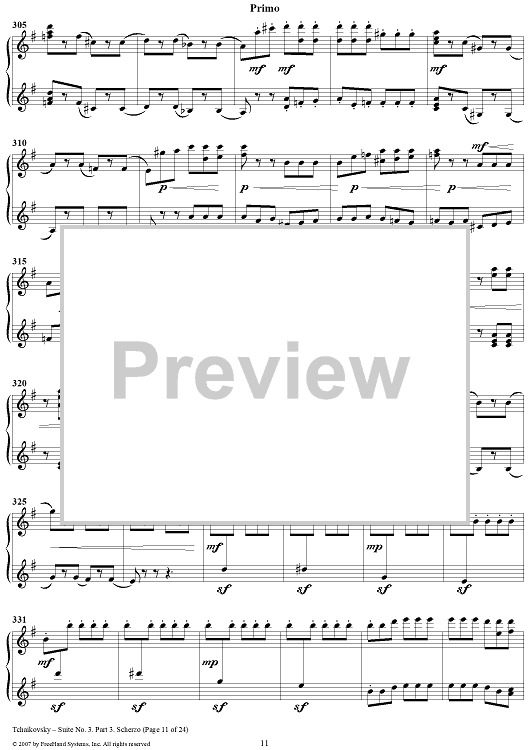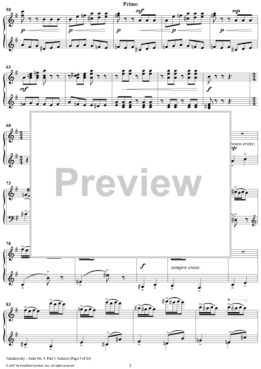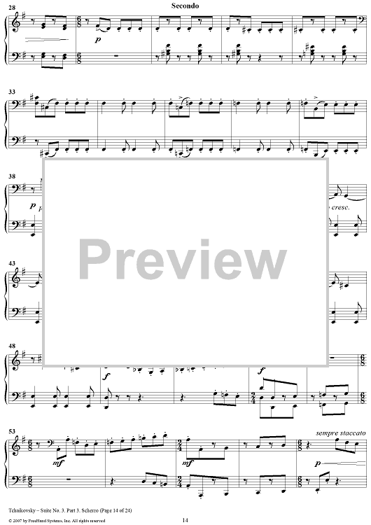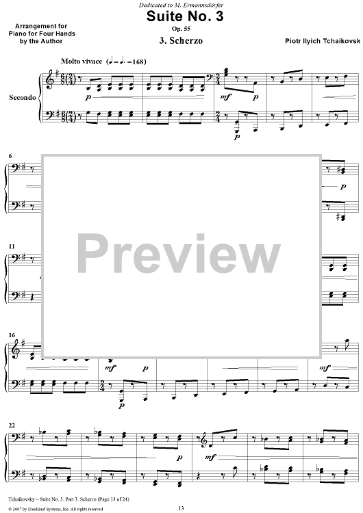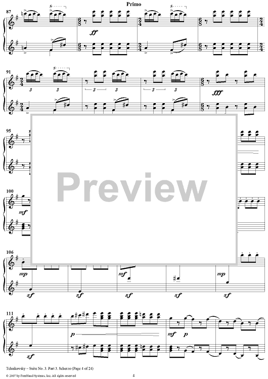 Digital Sheet Music for Suite No. 3 for Orchestra. Part 3. Scherzo by Peter Ilyich Tchaikovsky scored for 1 Piano, 4 Hands; id:364647