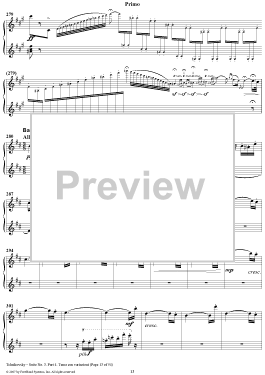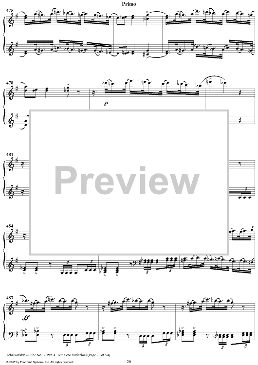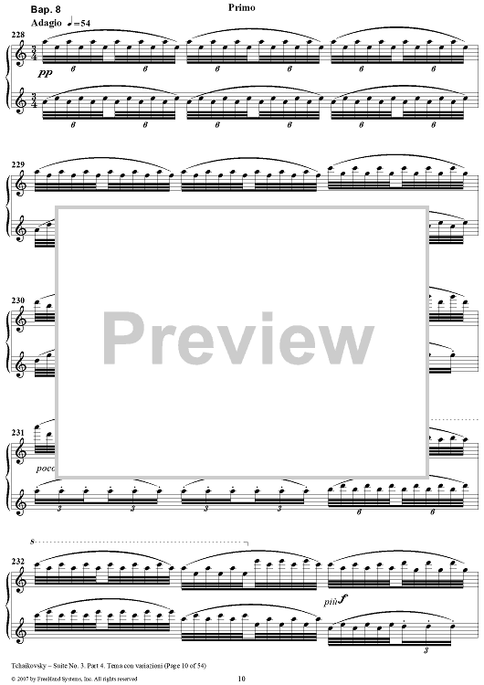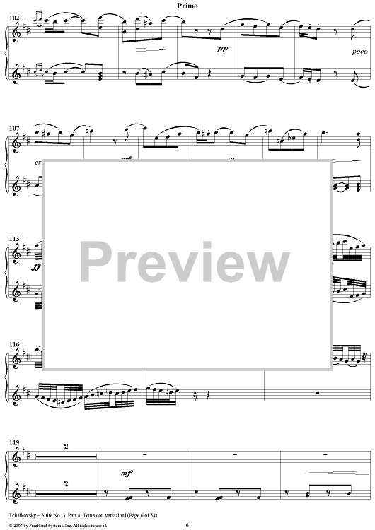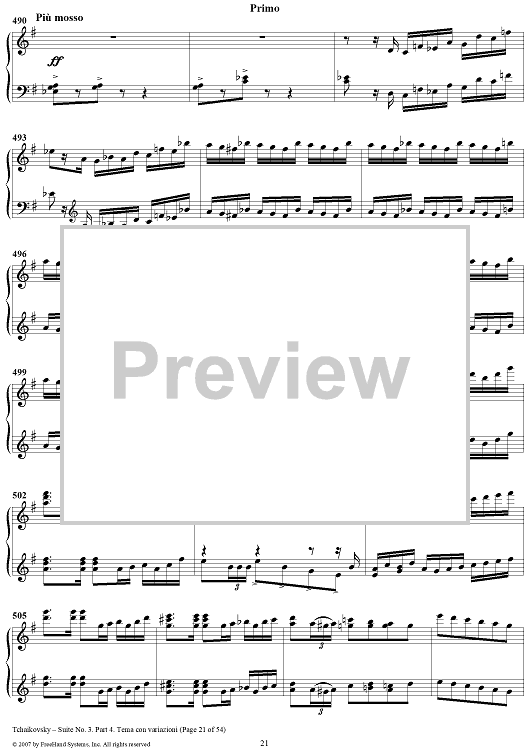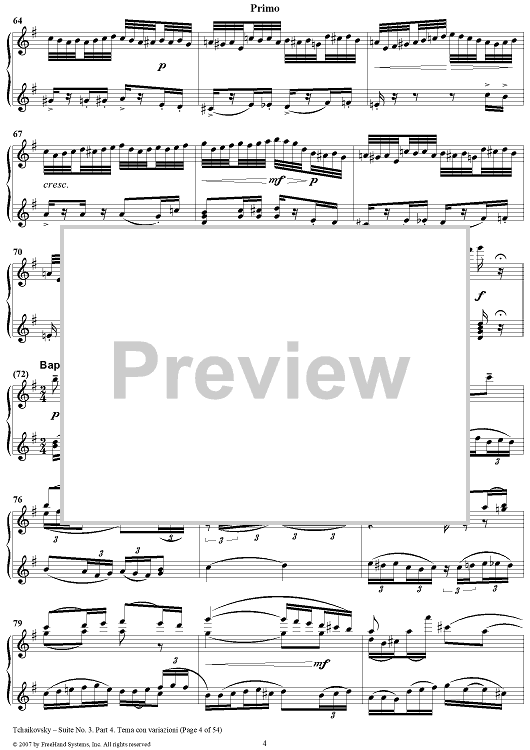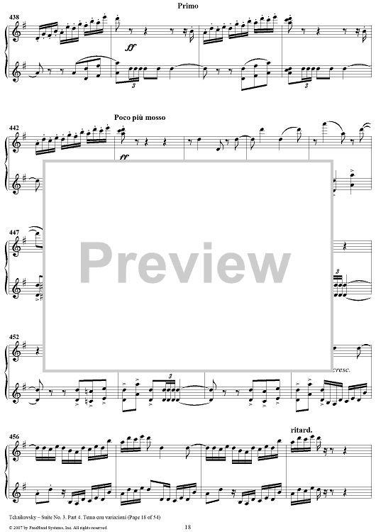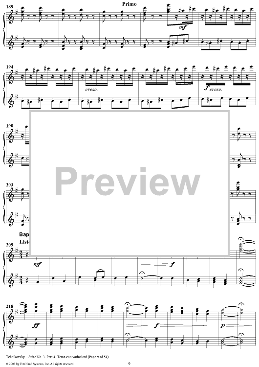 Digital Sheet Music for Suite No. 3 for Orchestra. Part 4. Tema con variazioni by Peter Ilyich Tchaikovsky scored for 1 Piano, 4 Hands; id:364649