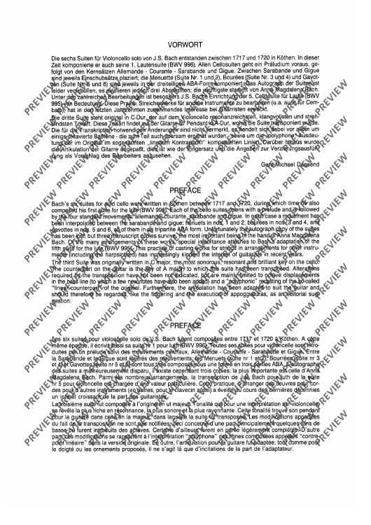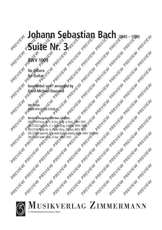 Um auch Gitarristen einen Zugang zu den Bach'schen Cellosuiten zu ermöglichen, hat Gerd-Michael Dausend diese für Gitarre eingerichtet. Im Original steht die dritte Suite in C-Dur, der auf dem Cello strahlendsten Tonart, das Pendant auf der Gitarre dazu ist A-Dur, daher wurde die Suite transponiert. Fingersätze und Angaben zur Verzierungsausführung sind vom Bearbeiter ergänzt worden.