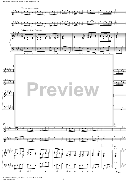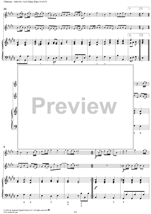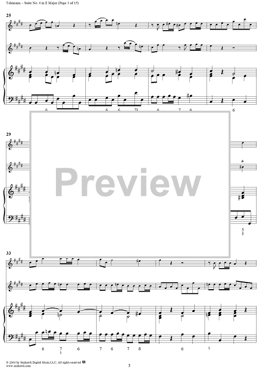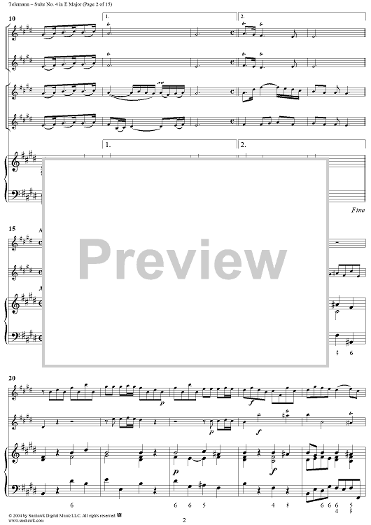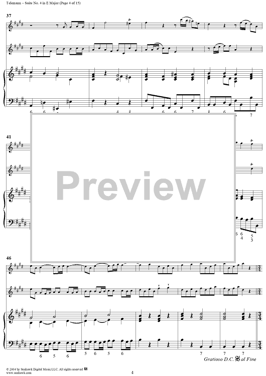 Digital Sheet Music for Suite No. 4 in E Major - Piano Score by Georg Philipp Telemann scored for Flute, Violin and Basso Continuo; id:303247