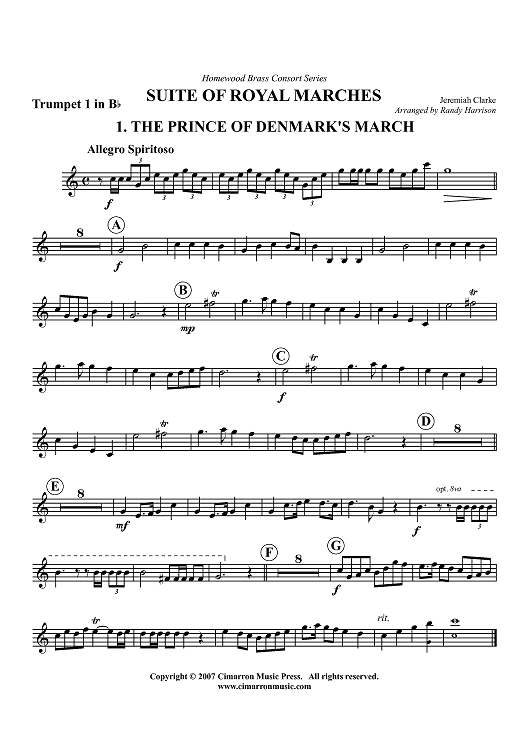 Digital Sheet Music for Suite of Royal Marches - Trumpet 1 in B-flat by Jeremiah Clarke, Randy Harrison scored for Brass Quintet; id:365687