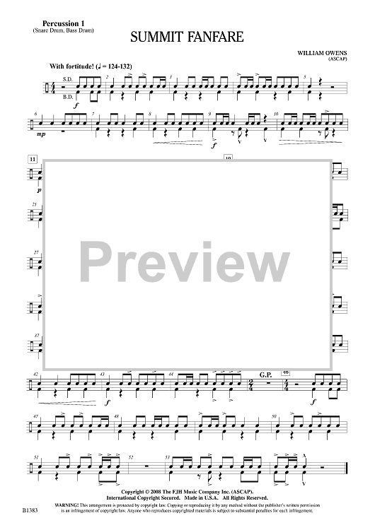 Digital Sheet Music for Summit Fanfare - Percussion 1 by William Owens scored for Beginning Band; id:501577