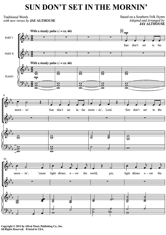 Digital Sheet Music for Sun Don't Set in the Mornin' by Jay Althouse, Southern Folk Song scored for Piano/Vocal; id:500397