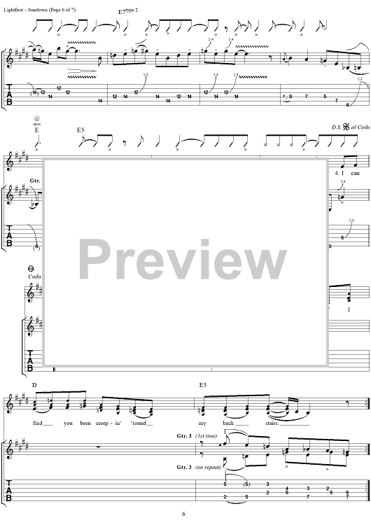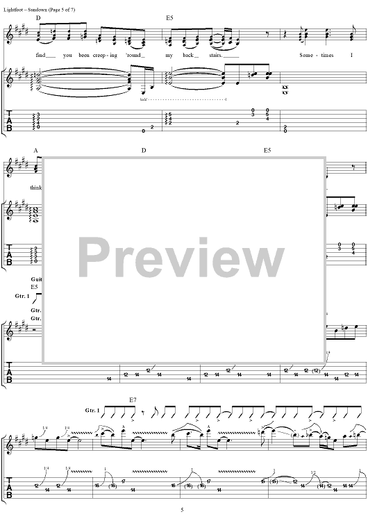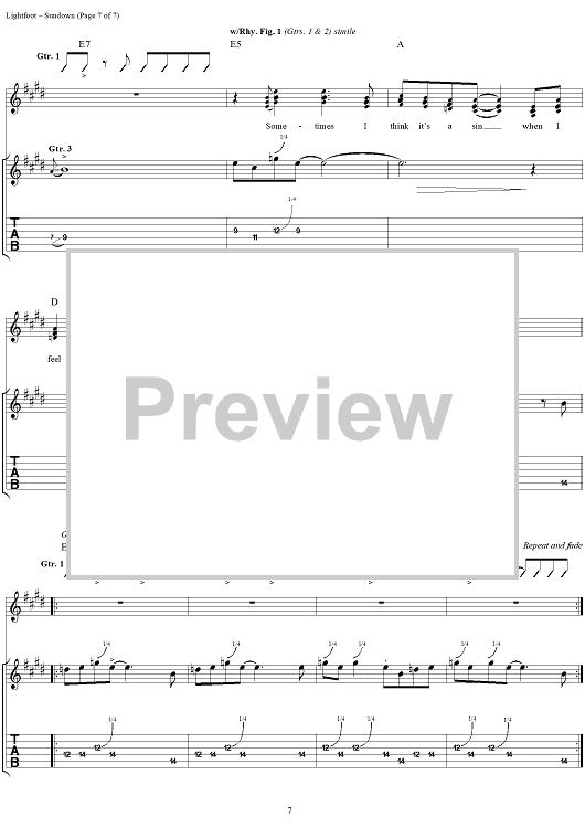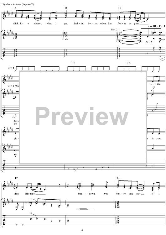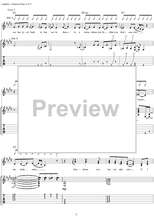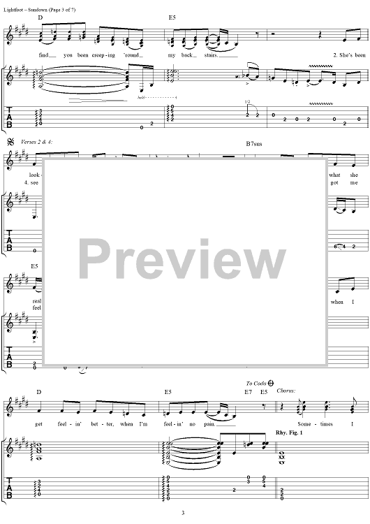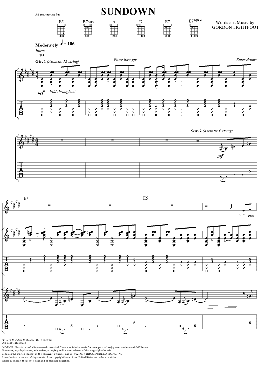 Digital Sheet Music for Sundown by Gordon Lightfoot scored for Guitar Tab/Vocal; id:119663