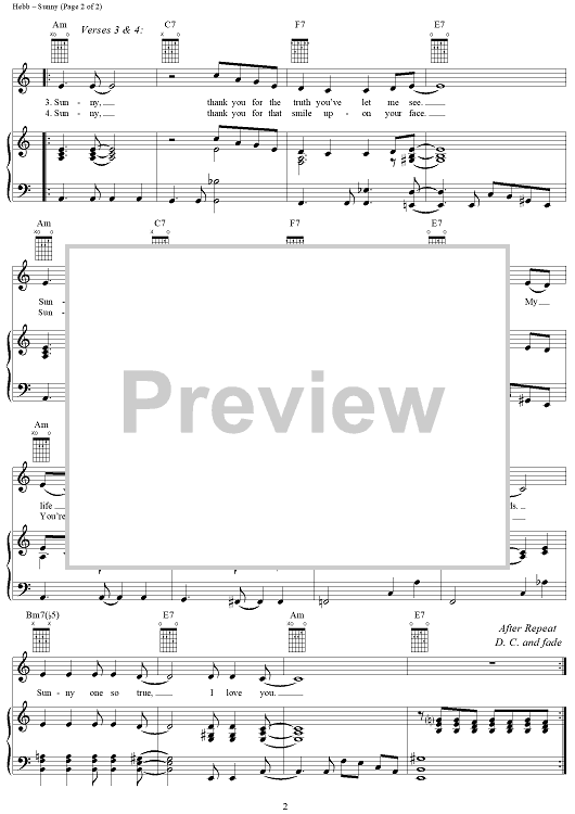 Digital Sheet Music for Sunny by Bobby Hebb scored for Piano/Vocal/Chords; id:201387