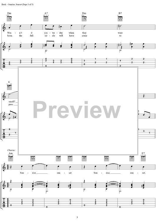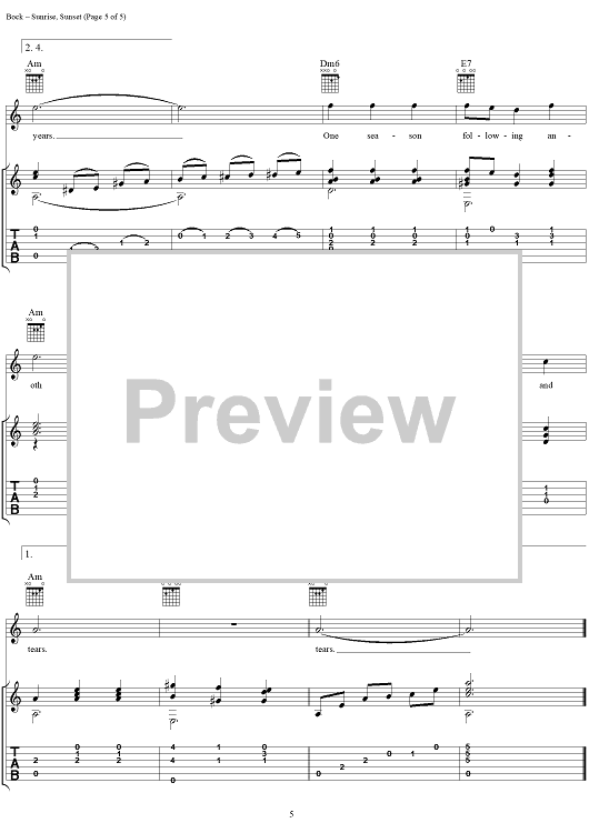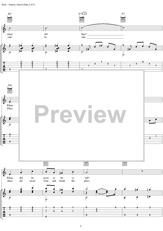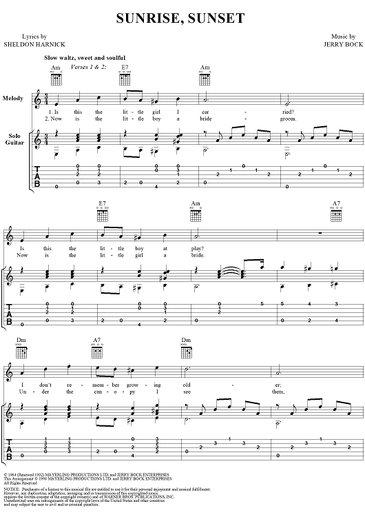 Digital Sheet Music for Sunrise, Sunset by Jerry Bock, Sheldon Harnick, Jerry Silverman scored for Guitar Tab/Vocal; id:274932