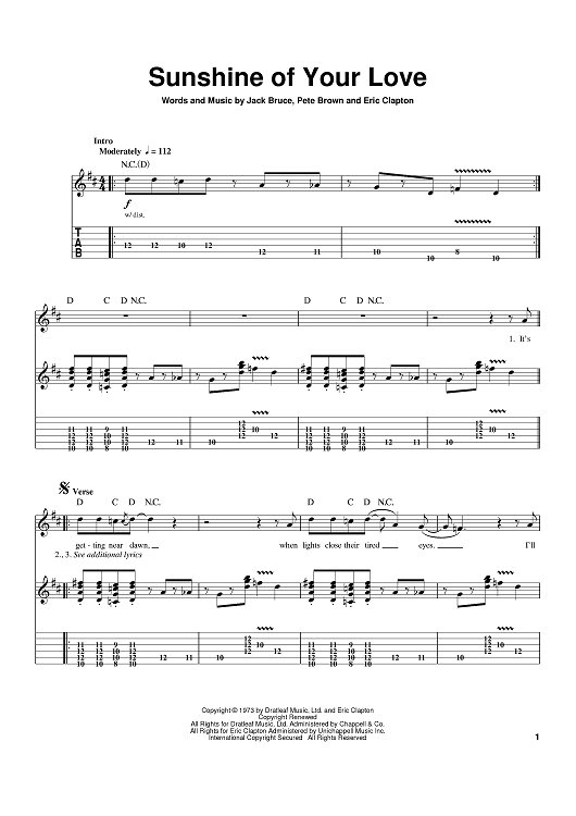 Digital Sheet Music for Sunshine Of Your Love by Eric Clapton, Cream, Pete Brown, Jack Bruce scored for Guitar Tab; id:374160