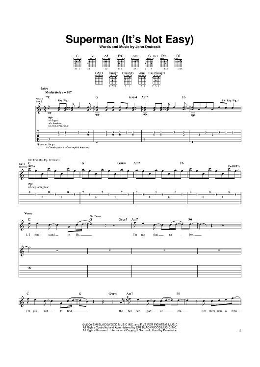 Digital Sheet Music for Superman (It's Not Easy) by Five for Fighting scored for Guitar Tab; id:367807
