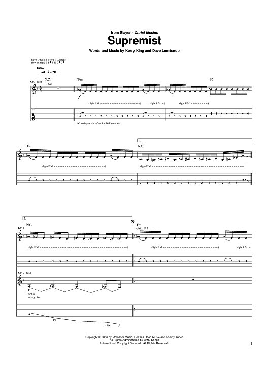 Digital Sheet Music for Supremist by Kerry King, Dave Lombardo, Slayer scored for Guitar Tab; id:397560