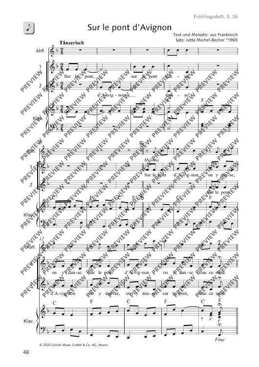Digital Sheet Music for Sur Le Pont D'Avignon by Jutta Michel-Becher, Traditionell scored for For Two Part Choir And Piano, Alto Recorder Ad Lib.; id:500009