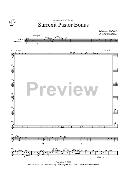 Digital Sheet Music for Surrexit Pastor Bonus - Choir 1, Trumpet 1 by Giovanni Gabrieli, James Klages scored for Trumpet Choir; id:317920