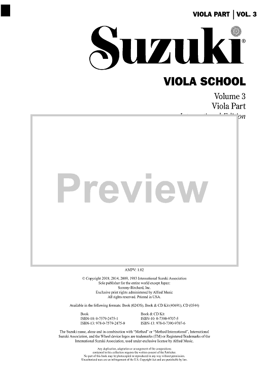 "Suzuki Viola School, Volume 3 - Viola Part" Sheet Music by William Preucil Sr.