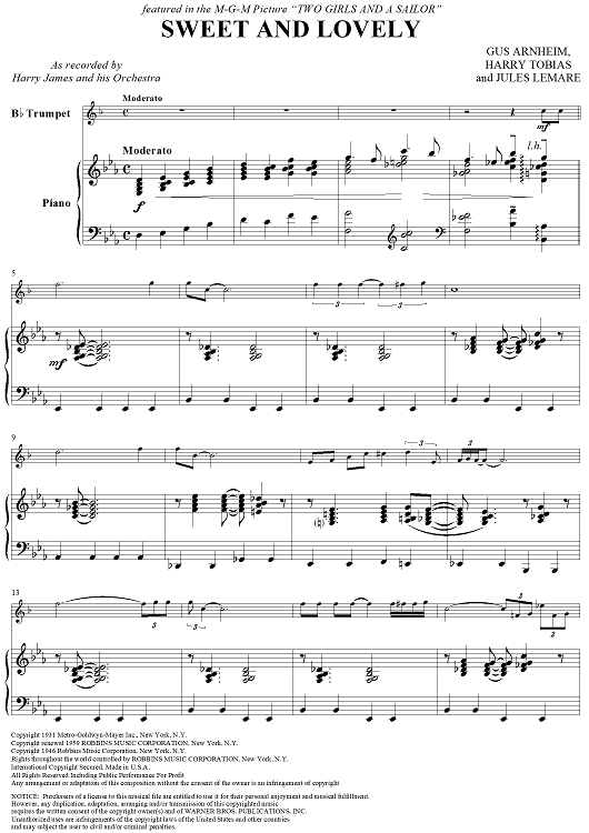 Digital Sheet Music for Sweet and Lovely - Piano Score by Gus Arnheim, Harry Tobias, Jules Lemare, Harry James and His Orchestra scored for Trumpet/Piano; id:355835