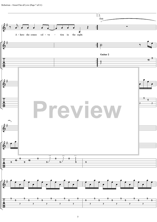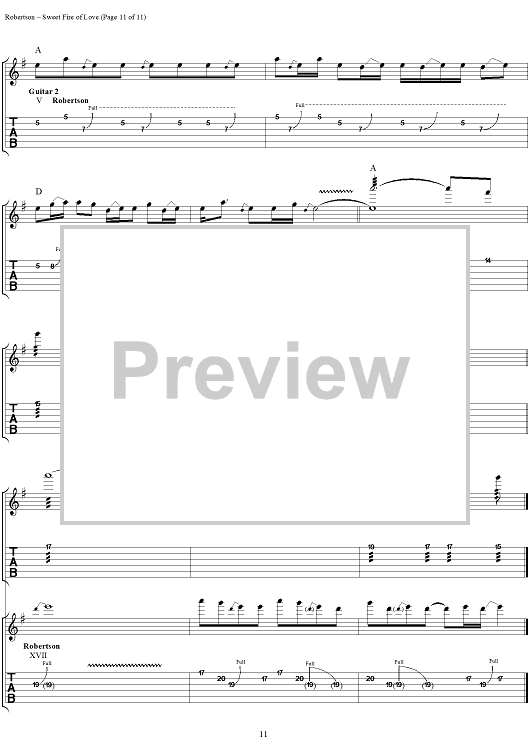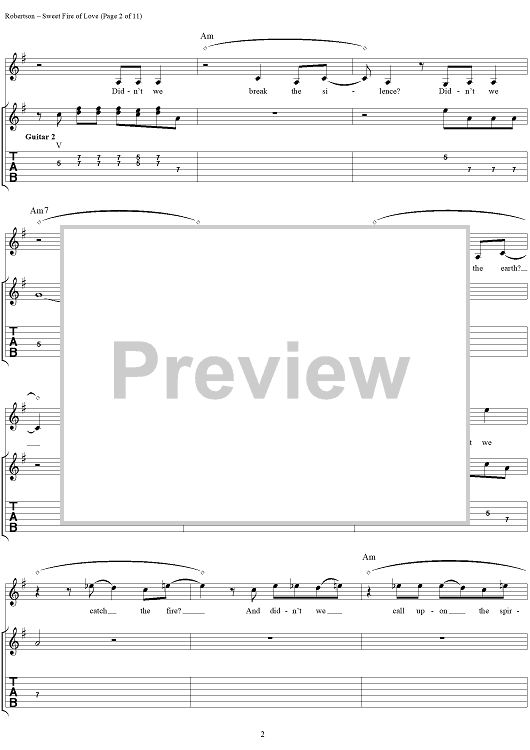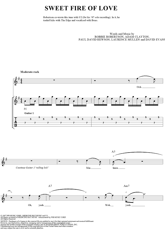 Digital Sheet Music for Sweet Fire of Love by Robbie Robertson, Bono, David Evans, Adam Clayton, Larry Mullen Jr. scored for Guitar Tab/Vocal; id:255986