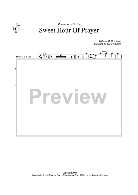 Digital Sheet Music for Sweet Hour of Prayer - Descant in B-flat by William B. Bradbury scored for Brass Quartet with Optional Descant; id:317240