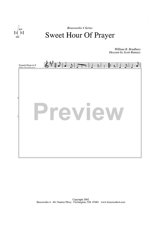 Digital Sheet Music for Sweet Hour of Prayer - Horn in F by William B. Bradbury scored for Brass Quartet with Optional Descant; id:317245