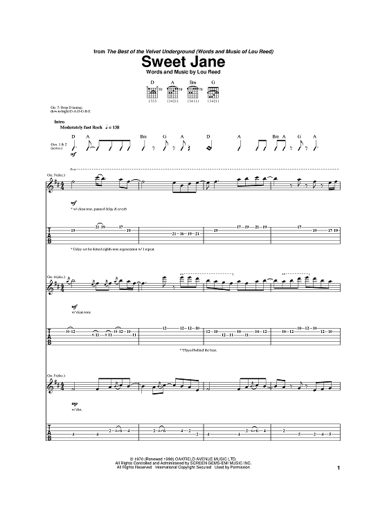 Digital Sheet Music for Sweet Jane by Lou Reed scored for Guitar Tab; id:372903