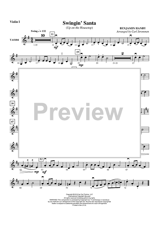 Digital Sheet Music for Swingin’ Santa (Up on the Housetop) - Violin 1 by Carl Strommen, Benjamin Hanby scored for String Orchestra; id:431815