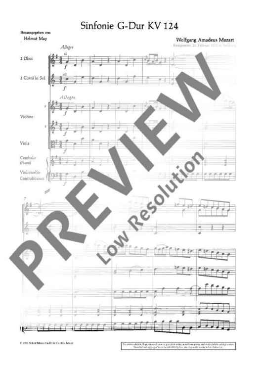 This valuable though seldom played early work from his Salzburg period contains the entire youthful charme of Mozart. It can be played without wind instruments whose parts are in-cluded in the strings. In this case, even the piano or harpsichord can be added as sound filler as was often done by Mozart himself when he conducted a work sitting at the respective instrument.
