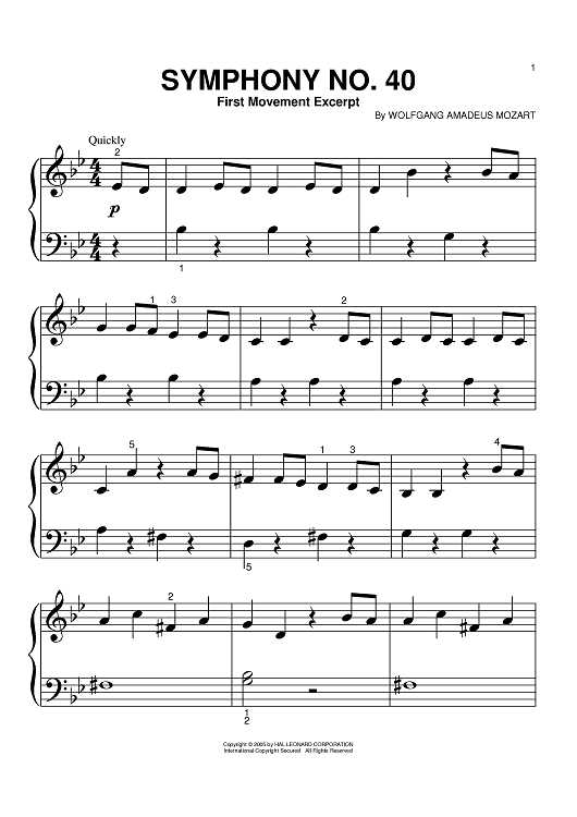 Digital Sheet Music for Symphony No. 40 in G Minor, First Movement Excerpt by Wolfgang Amadeus Mozart scored for Big Note Piano; id:383127