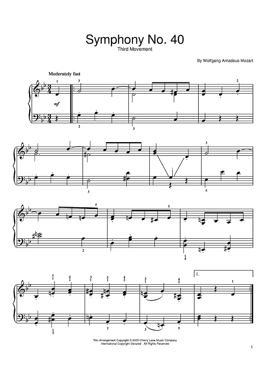 Digital Sheet Music for Symphony No. 40 in G Minor, Third Movement ("Minuet") by Wolfgang Amadeus Mozart scored for Easy Piano; id:387901