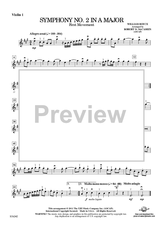 Digital Sheet Music for Symphony No. II in A Major (1st Movement) - Violin 1 by William Boyce, Robert D. McCashin scored for String Orchestra; id:421929