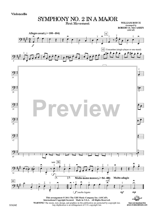 Digital Sheet Music for Symphony No. II in A Major (1st Movement) - Violoncello by William Boyce, Robert D. McCashin scored for String Orchestra; id:421932