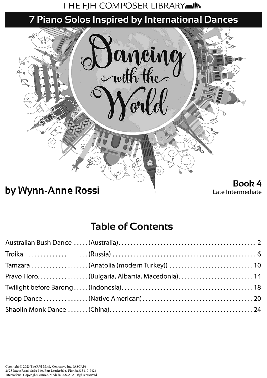 A new, four-book series by composer Wynn-Anne Rossi. The Dancing with the World series is inspired by international dance, rhythms and melodies, uniting performers in the celebration of movement. A brief introduction related to the background of each dance is included for every piece, and the music can be used as the basis of a themed recital to celebrate the history and cultural significance of each dance.