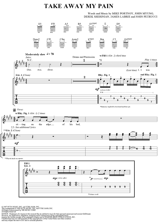 Digital Sheet Music for Take Away My Pain by John Myung, Michael Portnoy, Derek Sherinian, Dream Theater, John Petrucci, James LaBrie scored for Guitar Tab/Vocal; id:113008