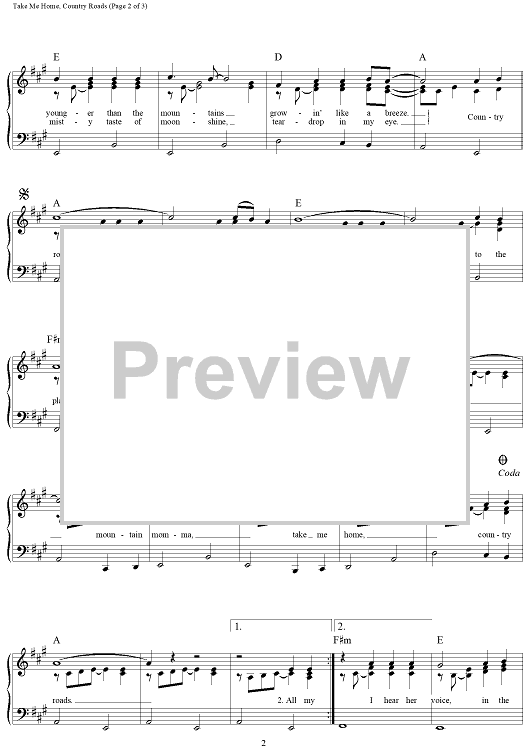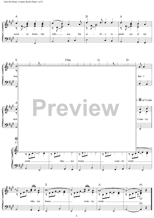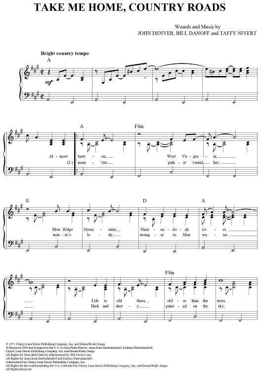 Digital Sheet Music for Take Me Home, Country Roads by Taffy Nivert, Bill Danoff, John Denver scored for Piano/Vocal/Chords; id:289280