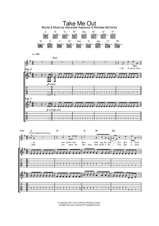 Digital Sheet Music for Take Me Out by Franz Ferdinand, Alexander Kapranos, Nicholas McCarthy scored for Guitar Tab; id:380199