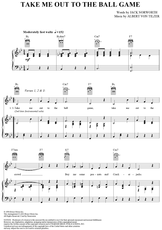 Digital Sheet Music for Take Me Out to the Ball Game by Jack Norworth, Albert von Tilzer scored for Piano/Vocal/Chords; id:289196