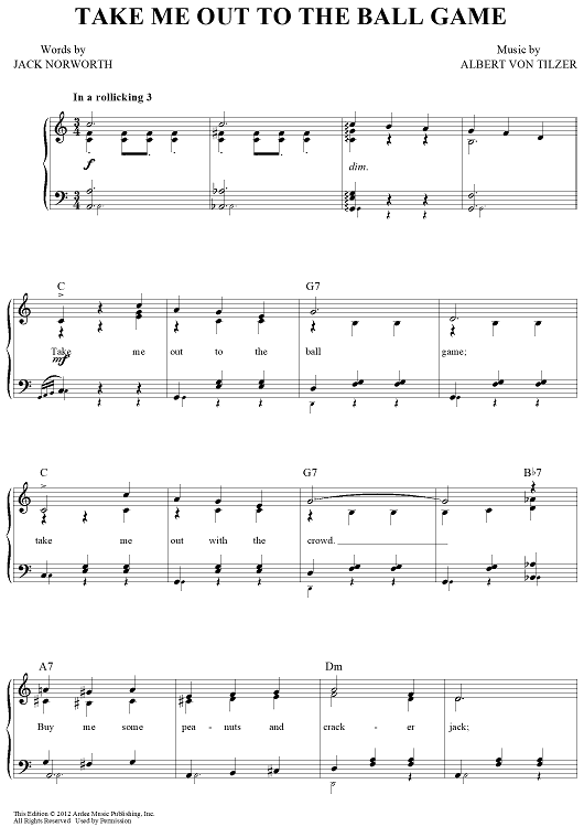 Digital Sheet Music for Take Me Out To The Ball Game by Jack Norworth, Albert von Tilzer scored for Easy Piano/Vocal/Chords; id:433107
